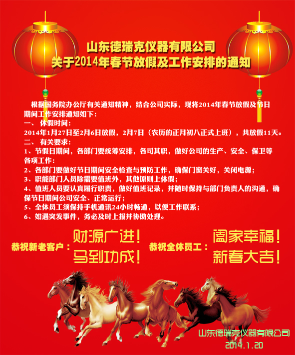 山东德瑞克2014年春节放假通知